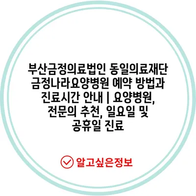 부산금정의료법인 동일의료재단 금정나라요양병원 예약 방법과 진료시간 공지 | 요양병원, 전연락 추천, 일요일 및 공휴일 진료 에 대해 자주 묻는 질문 TOP 5